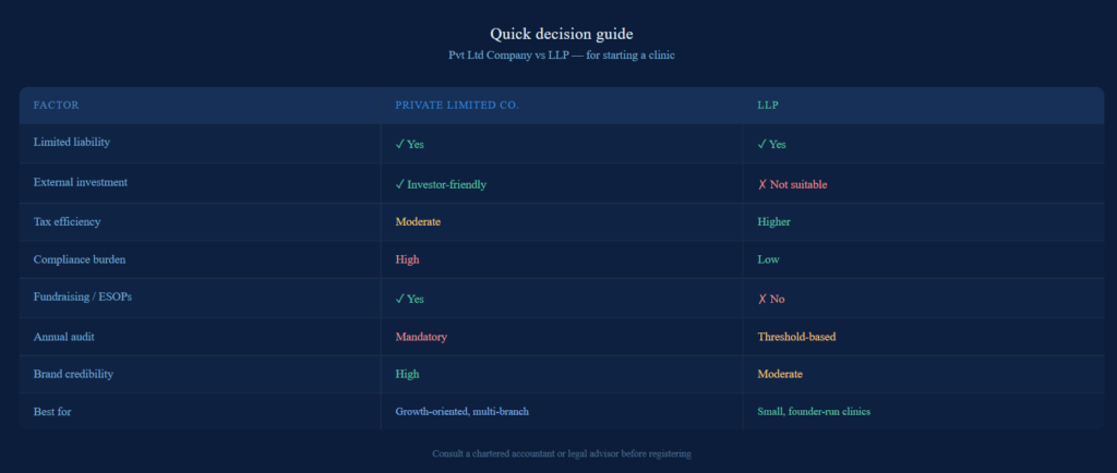 Verdict: LLP is considerably easier and cheaper to maintain for a small to medium clinic. A Pvt Ltd structure makes sense when the compliance cost is justified by scale or investor requirements.